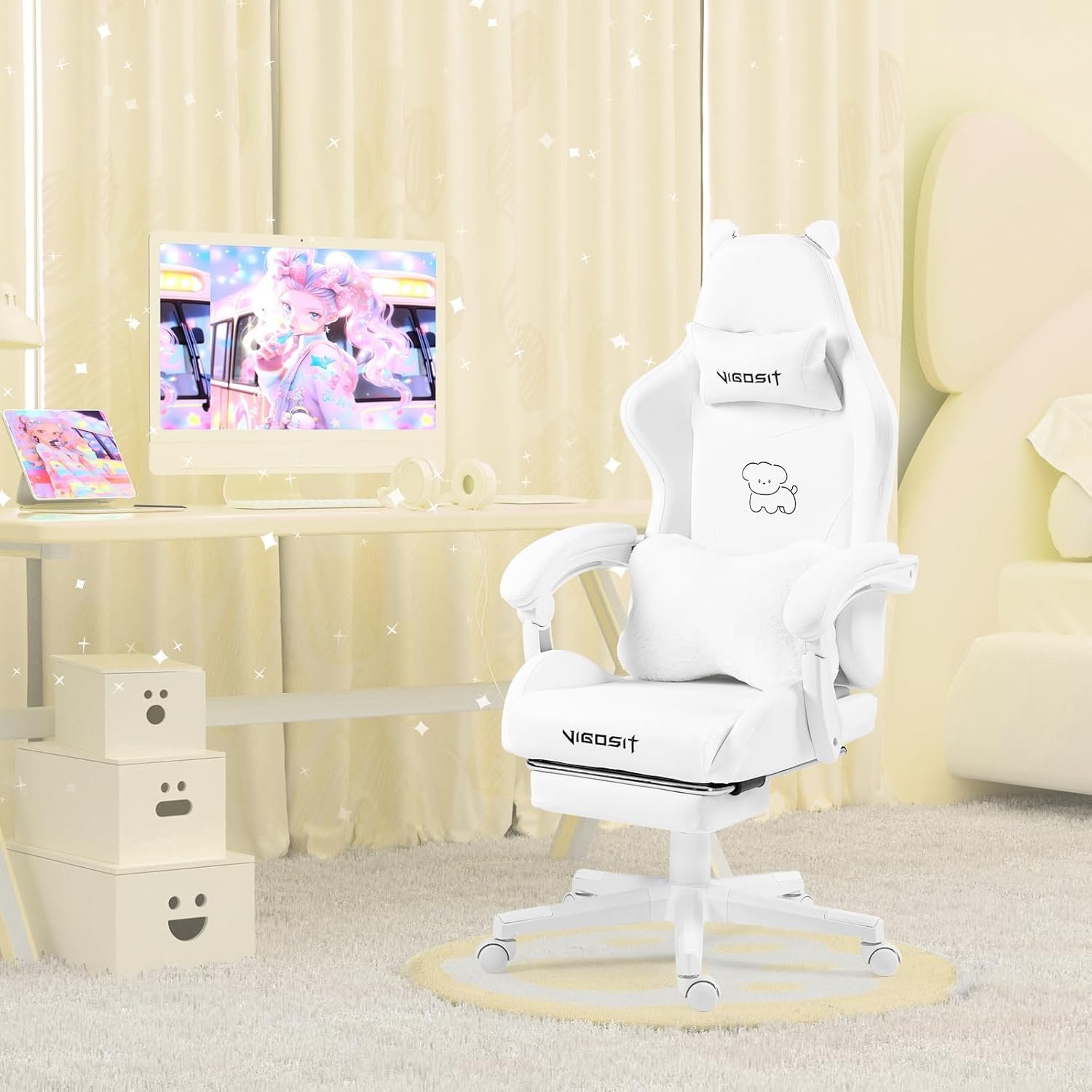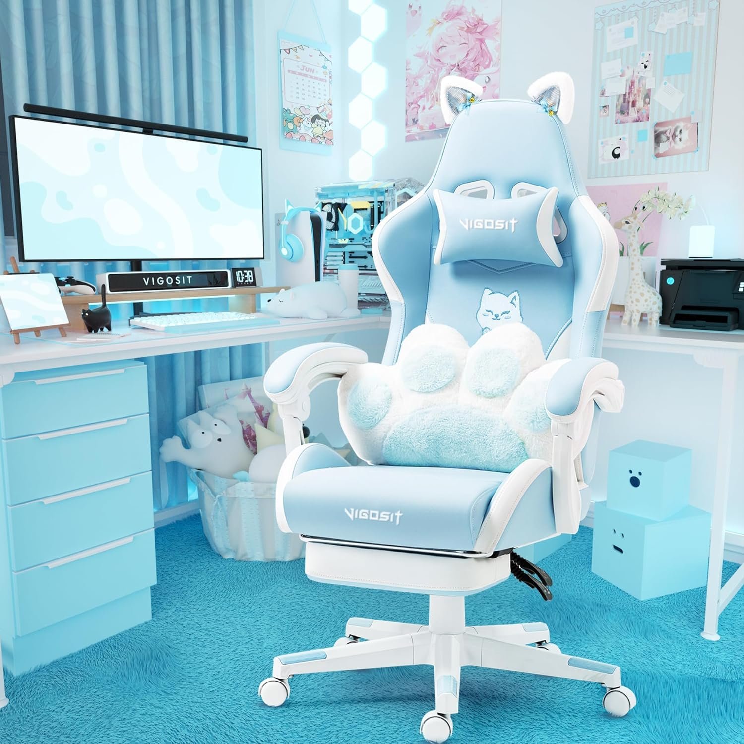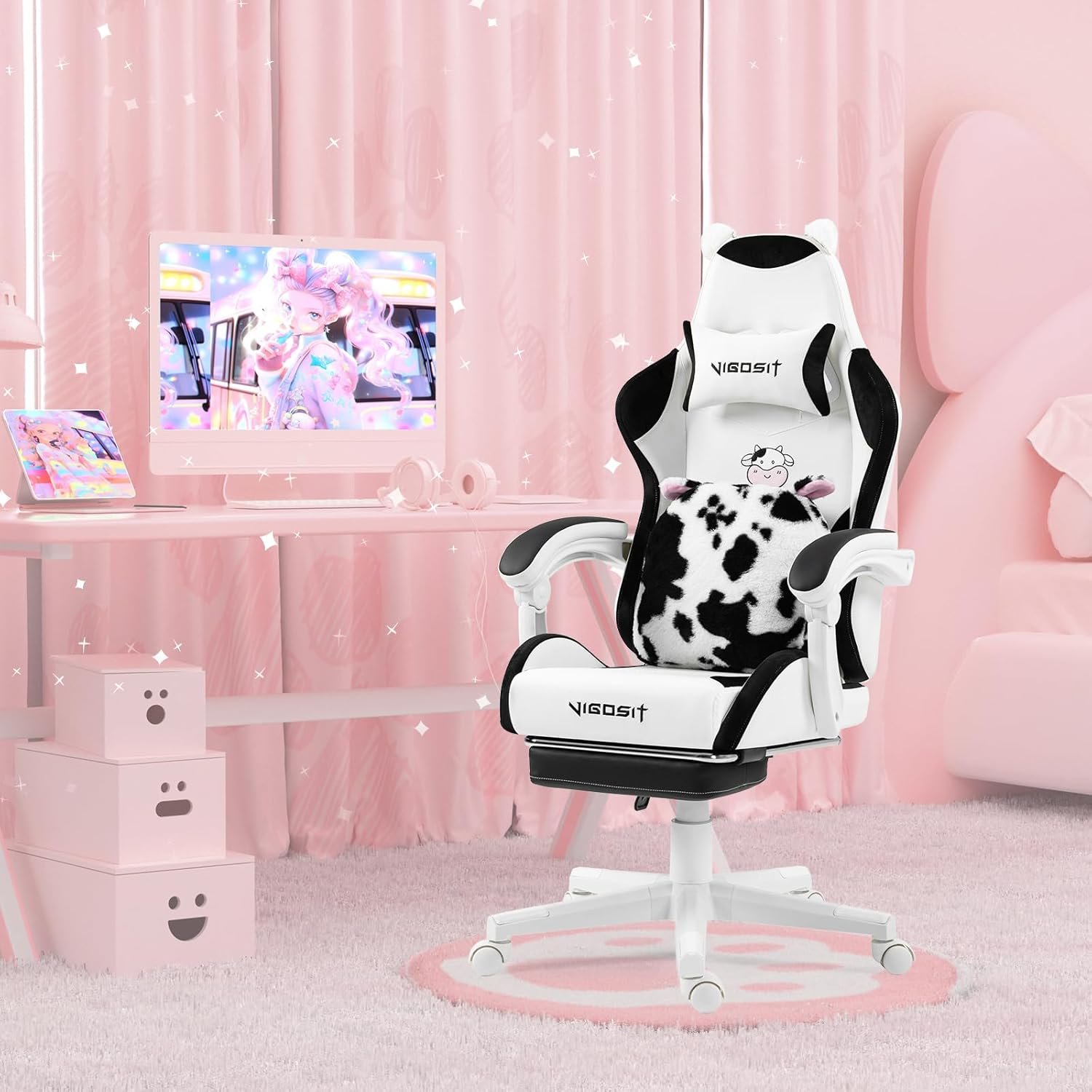 This  chair was designed with comfort and style in mind, specifically catering to women gamers. The chair comes with a wider, thicker lumbar pillow in soft velvet, filled with high-density sponge for extra support. This lumbar pillow is designed to better support the waist, providing a more comfortable gaming or working experience. The headrest is fully adjustable, allowing for easy customization to suit your needs.